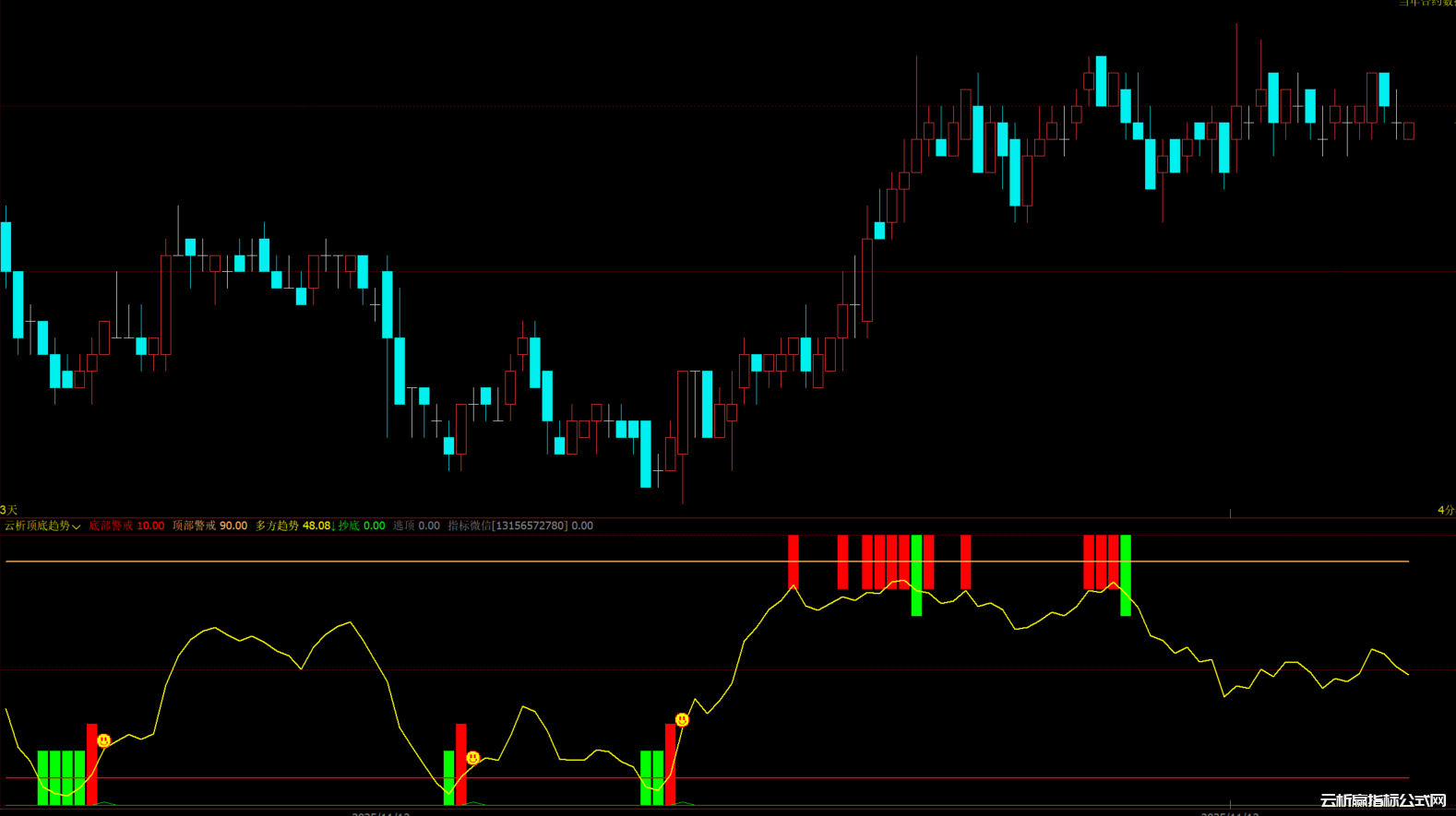 逻辑上,指标以 27 周期高低点为基准,将价格波动转化为 0-100 的区间数值。“底部警戒” 线(10)以下为超卖区,此时出现绿色柱体提示潜在底部;当价格趋势线上穿 10,红色柱体爆发,标志着短期反弹动能启动。“顶部警戒” 线(90)以上为超买区,红色柱体警示风险,线下穿 90 时绿色柱体出现,提示回调压力。