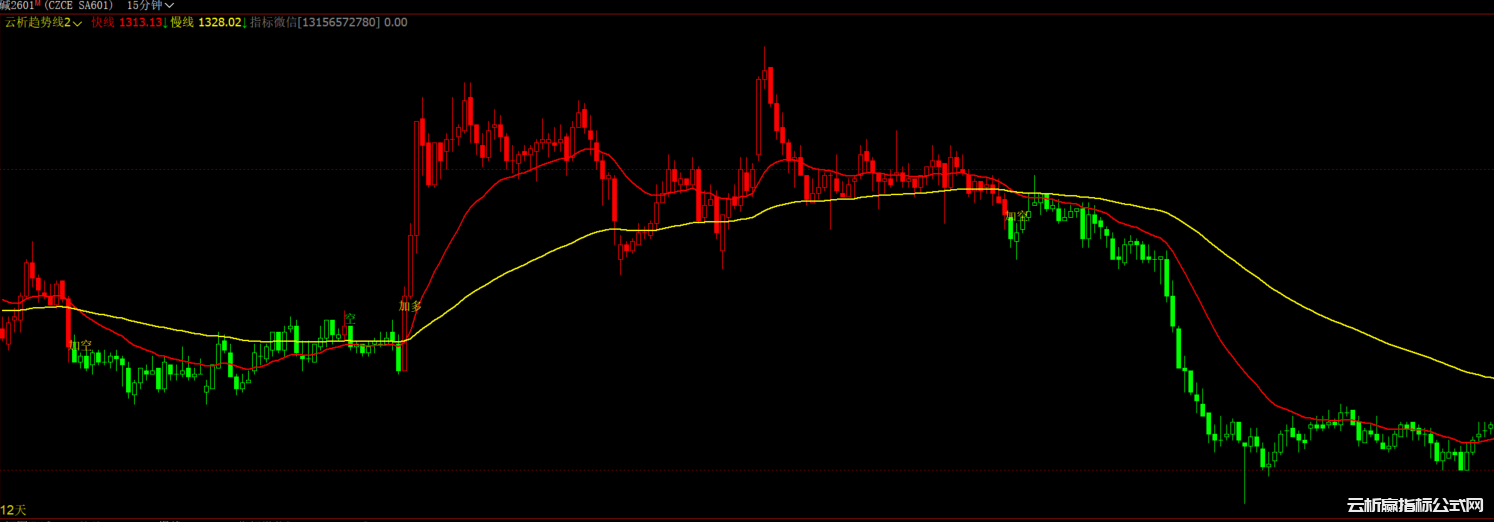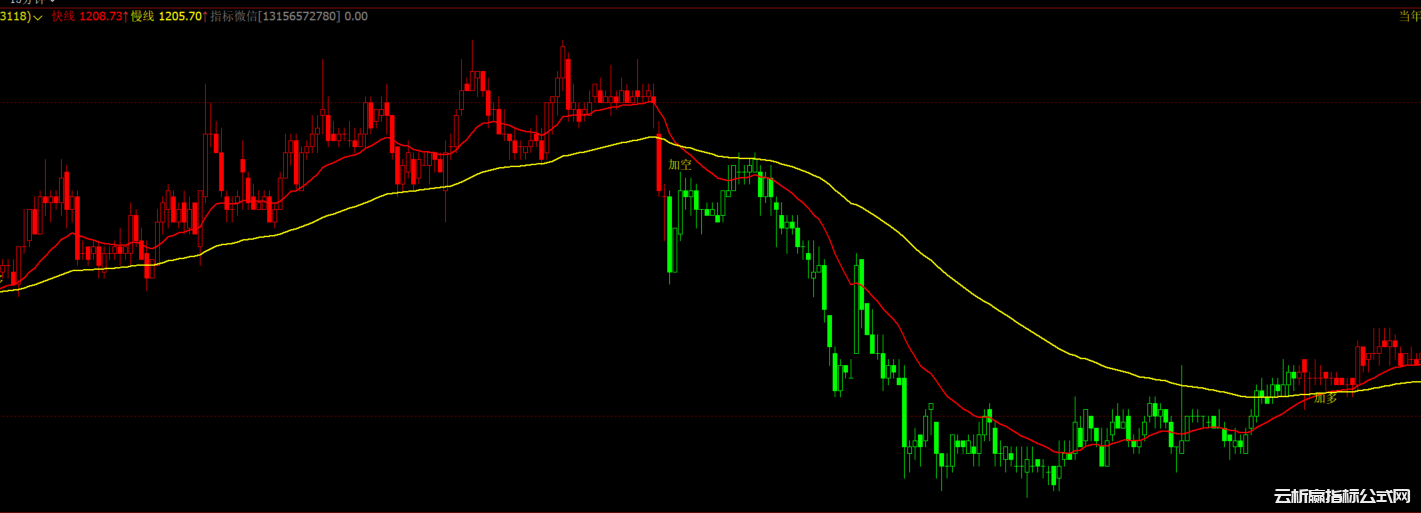 多信号:红色K线,快线红线上穿慢线黄线形成金叉,“加多”文字提示!