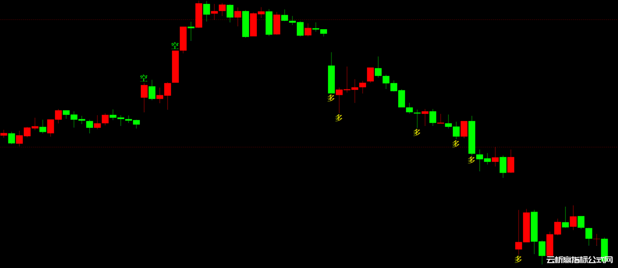 DRAWTEXT(跌破低点,L,’多’),COLORYELLOW,LINETHICK2,VALIGN0,FONTSIZE20;