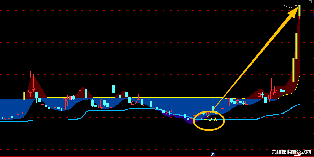 3、“圆弧见底”文字信号,意为有抄底反弹的机会,此时还要结合其他指标和量能配合,以及自身经验的判断,是否都在底部储能,一旦把握住这个见底,还是不错的机会!同时“圆弧见底”这个信号,也是被作为选股公式信号,大家可以根据自己的需求执行筛选!