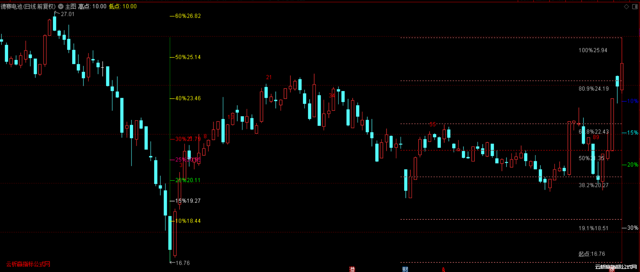 通达信黄金分割线百分比盈亏点位画线指标公式作为一种经典的技术分析工具,被广大股民所熟知和使用。该公式通过计算股价的历史高点和低点,自动绘制出不同比例的黄金分割线。这些分割线包括0.618、0.5、0.382等关键比例,它们分别对应着股价可能的支撑位和阻力位。