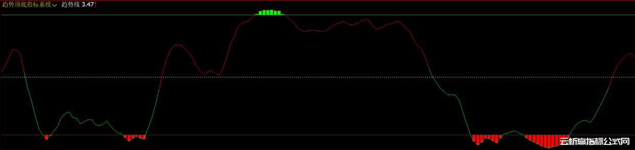 趋势顶底指标系统指标公式是一款用于文华财经软件wh6和wh7版本的幅图指标,此款指标主要是趋势线变色以及筑顶底区域标识,让我们在做波段行情的同时,也能观察到是否有顶底位置出现。