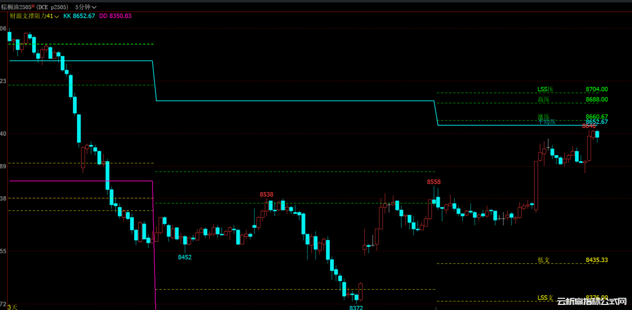 该公式通过分析历史价格数据,自动绘制支撑和压力线。支撑线位于价格下方,当价格接近支撑线时,可能会遇到买盘支持,从而反弹上涨。压力线位于价格上方,当价格接近压力线时,可能会遇到卖盘压力,从而回落下跌。通过这些线条,我们能够清晰地看到市场的潜在转折点。