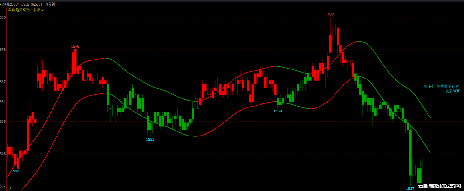 2、双轨线变色,红色上涨,绿色下跌,和K线变色是同步的信号,双轨线可以看趋势突破。