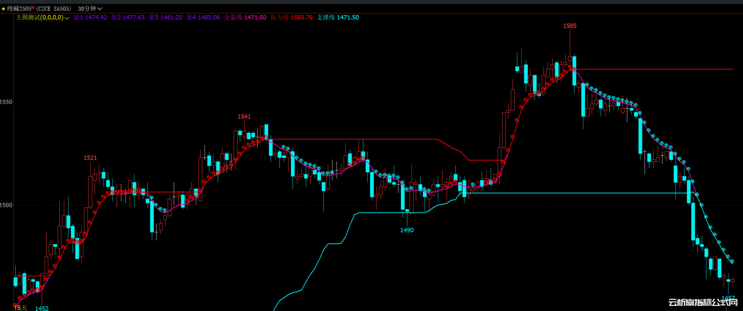 DRAWTEXT( 紫1<REF(紫1,1) AND 紫2<REF(紫2,1) AND 紫3<REF(紫3,1) AND 紫4<REF(紫4,1) ,交易线,’空’),COLORCYAN,FONTSIZE10;