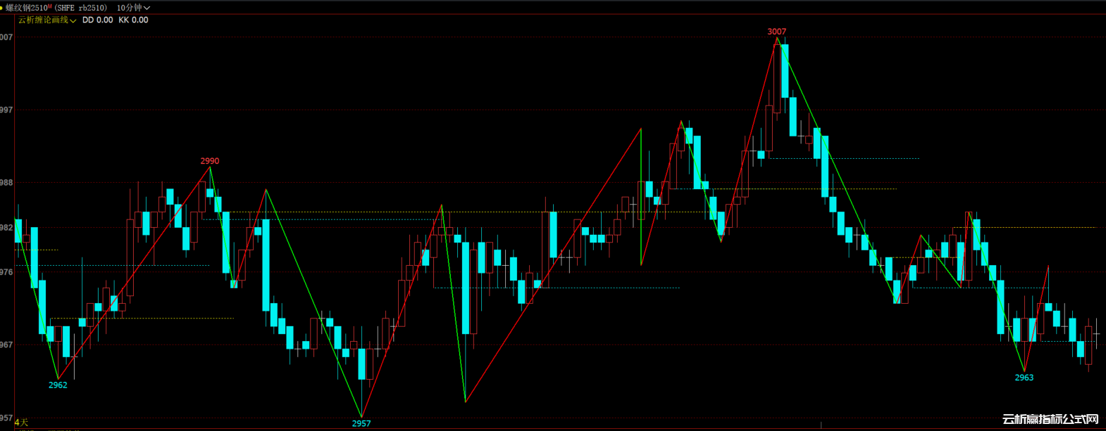 该指标通过5日和3日高低点的嵌套比较构建交易通道。当价格突破前5日高点并连续3日确认时绘制红色压力线;跌破前5日低点并连续3日确认时绘制绿色支撑线。系统自动标记关键突破位,用青黄虚线标注短期防守位。