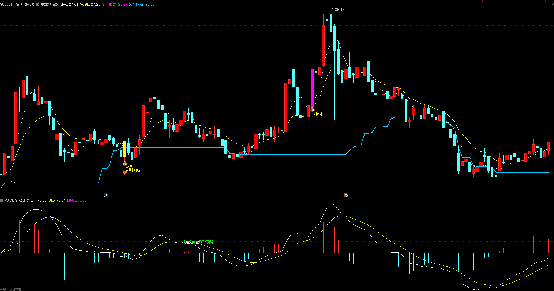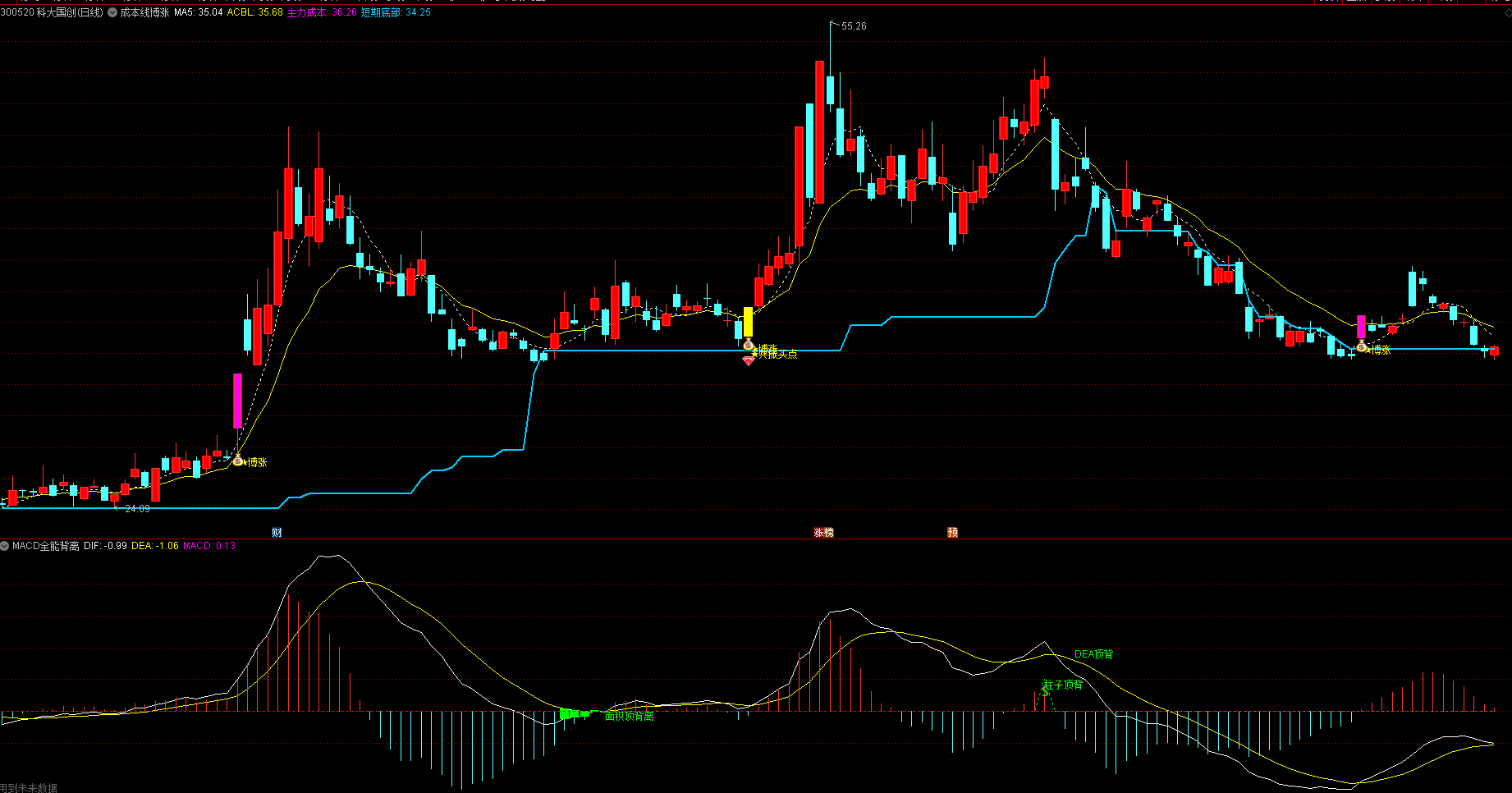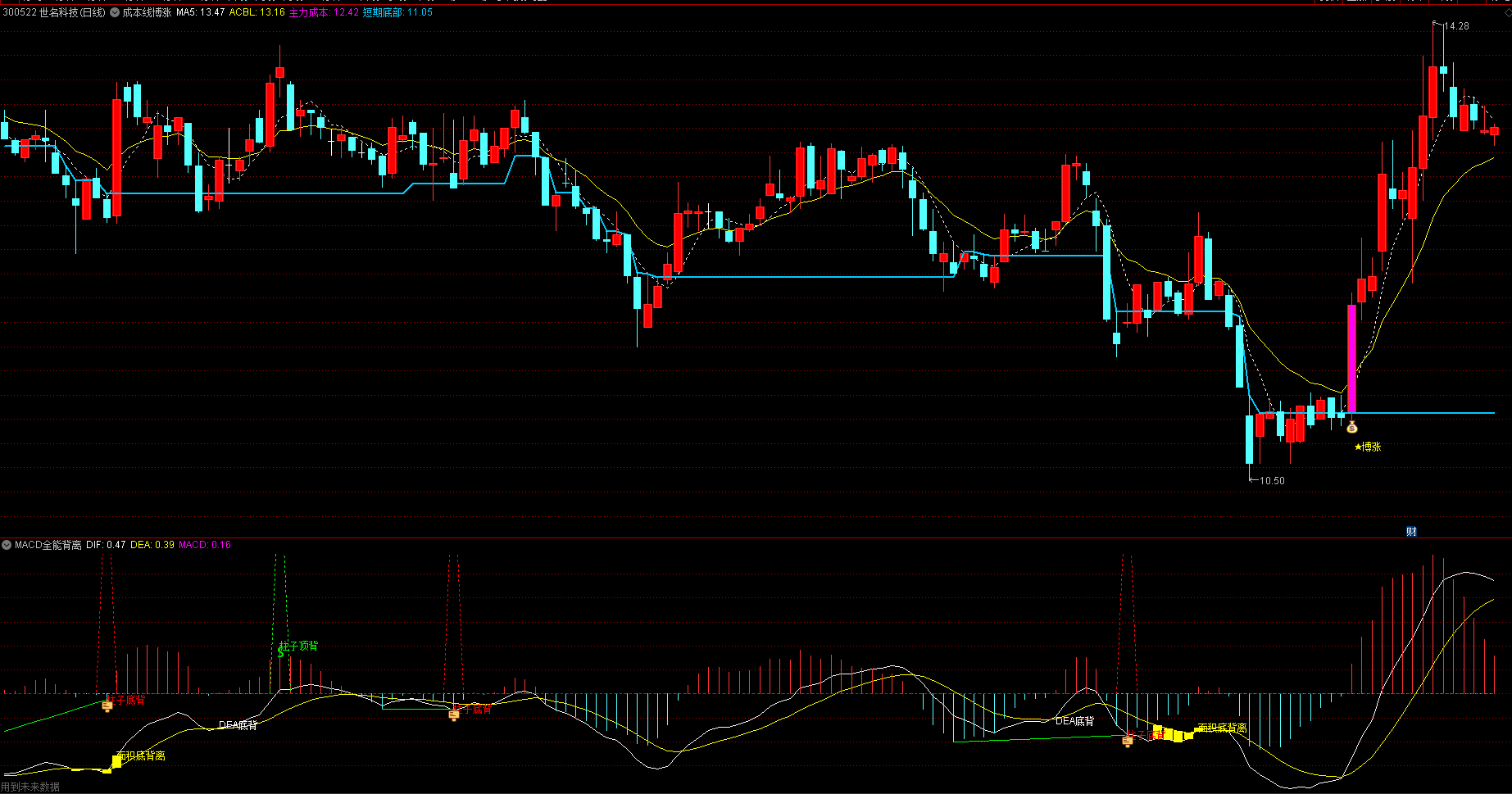通达信《共振博涨》成本线-macd顶底背离指标公式: