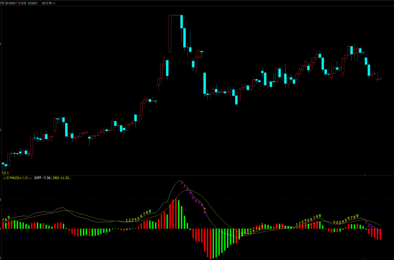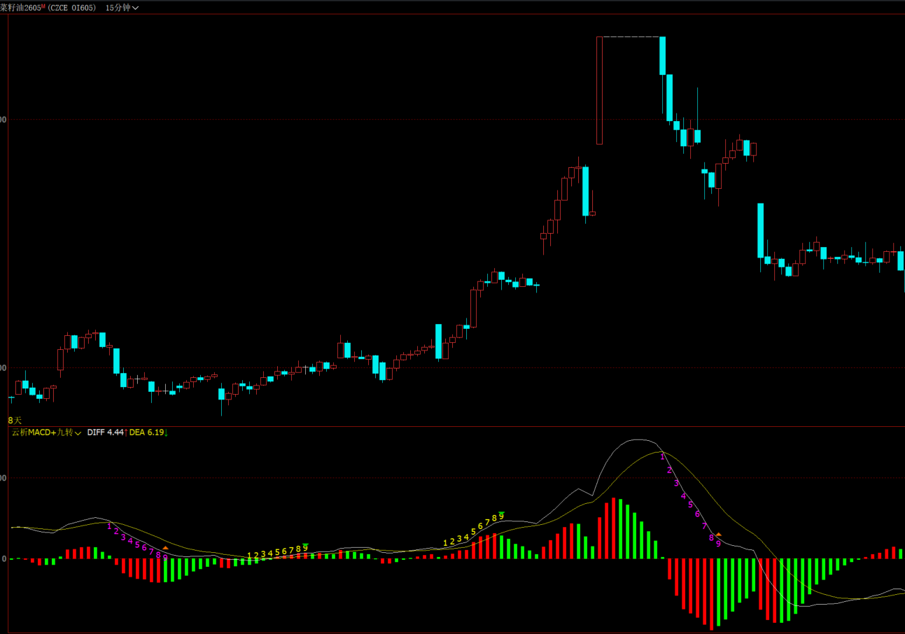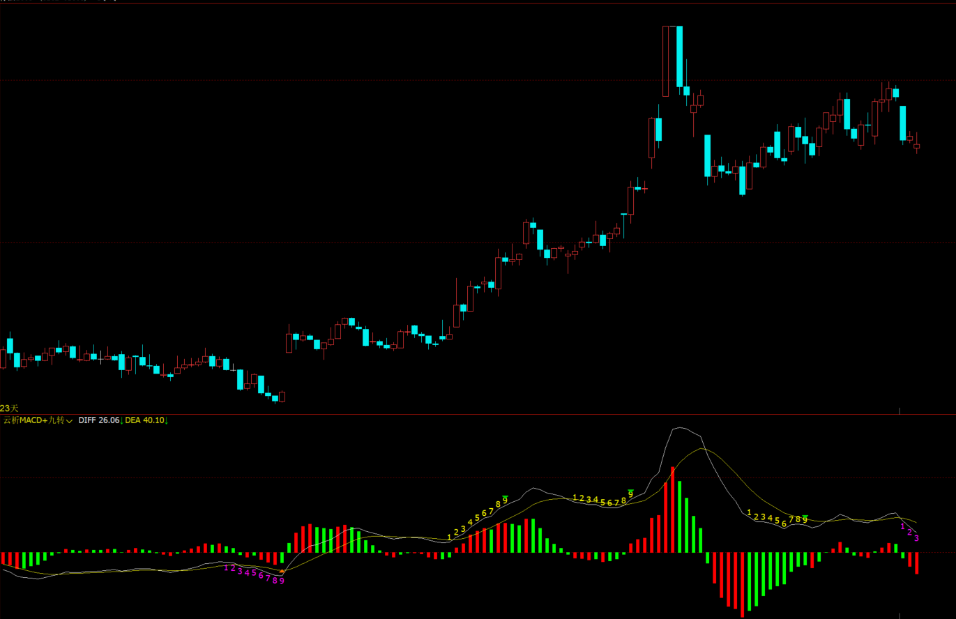其次,叠加了神奇九转的逻辑,数字1-9成功排列显示后,紫色是下跌九转,到9可能反转,黄字是上涨九转,到9可能回调下跌。