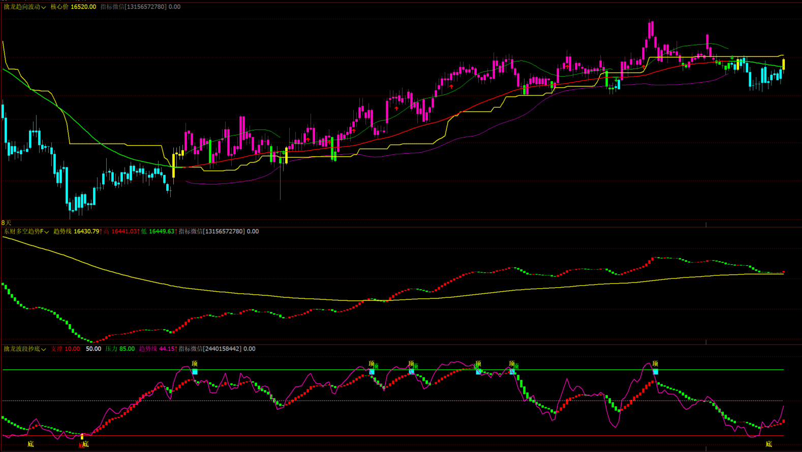 擒龙趋向波段主图: 红绿多空趋势线变色,黄线核心价线,出现通道是紫K,看多阶段;青色K,绿K是看空信号; 东财多空趋势F幅图: 红绿多空柱,黄线是趋势线,红绿柱上下穿黄线,预判趋势大方向的转折。 擒龙波段抄底幅图: 红绿多空柱,顶底坐标线,顶底文字信号 主图+两个幅图,都无未来函数,用于文华财经wh6 wh7