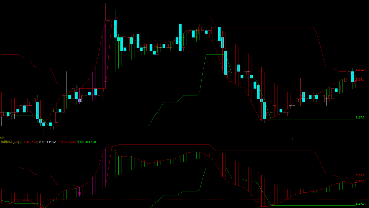 DRAWTEXT(CROSS(F,牛熊),LOW,’爆’),COLORMAGENTA,LINETHICK3;