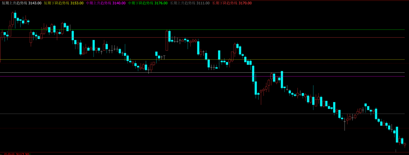 DRAWLINE1(ISLASTBAR,中期下降趋势线,REF(ISLASTBAR,1),REF(中期下降趋势线,1),0),COLORBLUE,LINETHICK2;