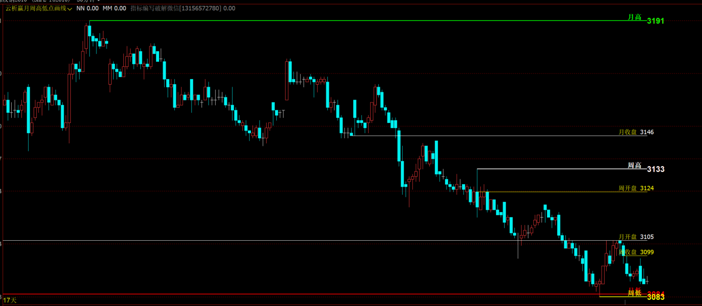 指标通过红绿白三色动态区分关键价位线,直观展示周期高低点与价格位置关系,实时标注月高、月低、周高、周低及周期开收盘数值,指标画线和文字标注清晰易读。