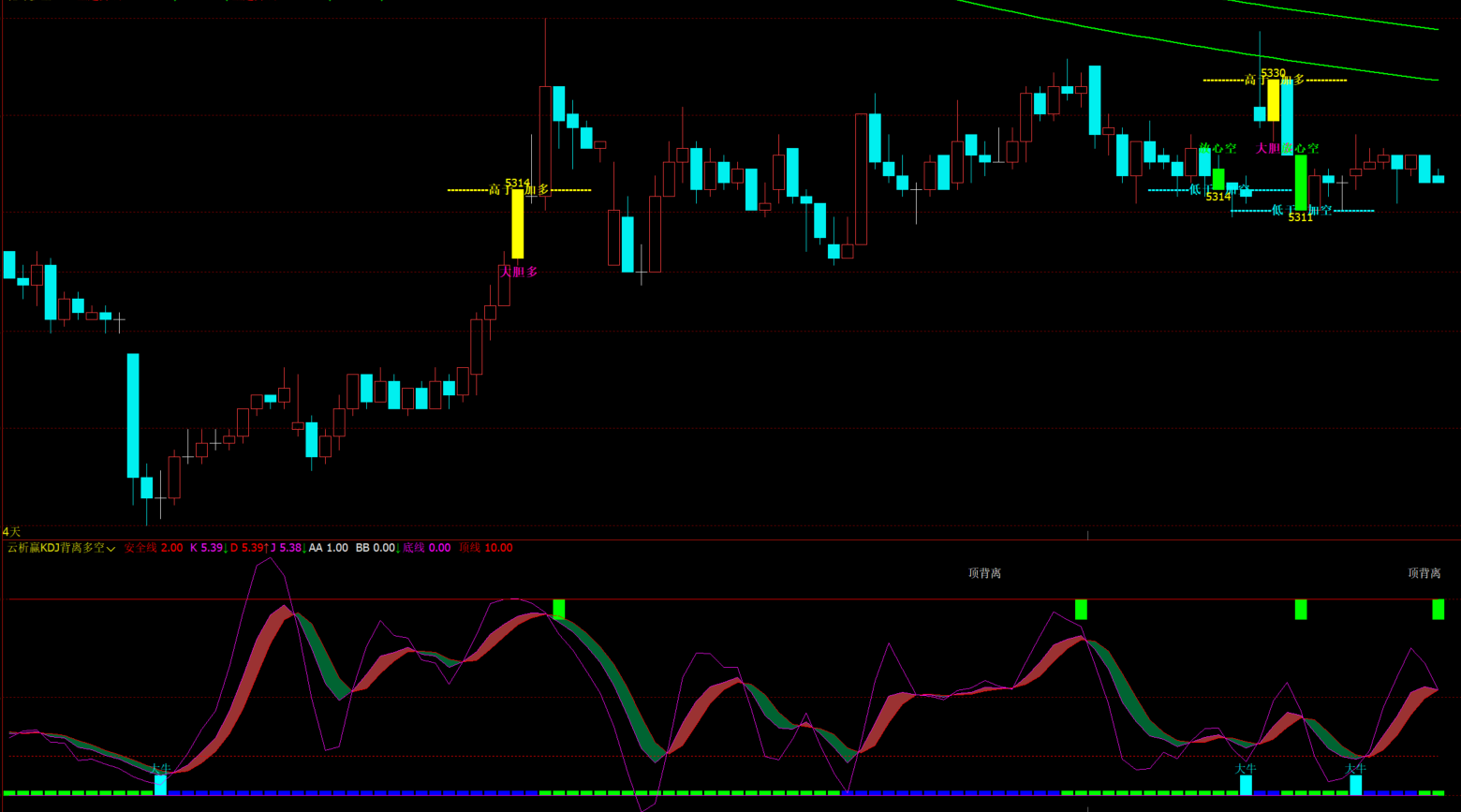 指标里面有短、中、大三种信号提示,配合顶背离、底背离标记,在关键转折位置给出清晰参考!